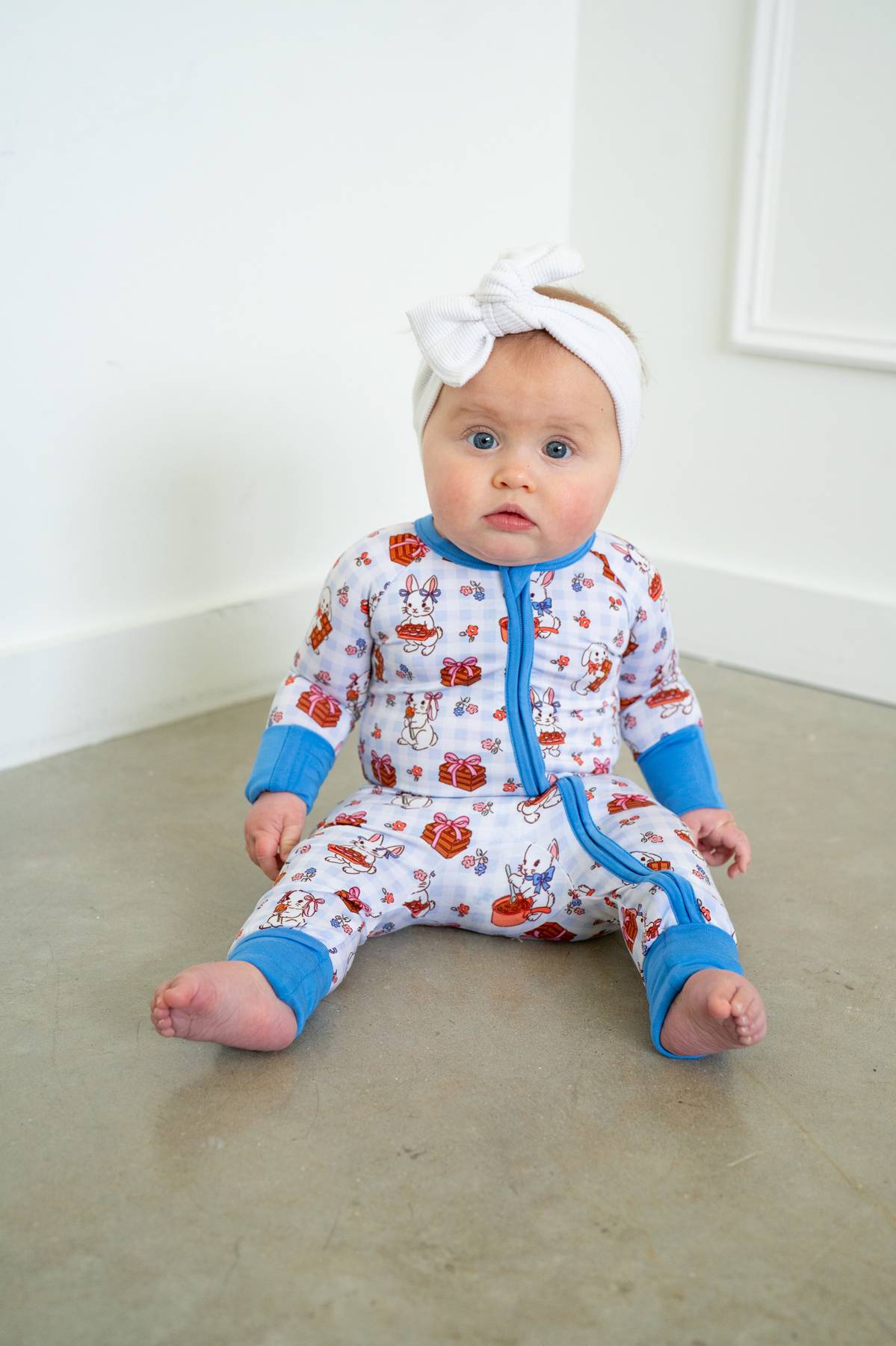 Featuring darling bunnies and chocolate nestled on a soft blue gingham background, finished with dainty florals and the sweetest bows tucked into bunny ears, our Chocolate Easter Bunnies jammies are made for little ones who love gentle details and cozy traditions. Soft, timeless, and full of Easter charm — they’re perfect for bedtime cuddles and morning egg hunts alike. 💕🐇🌸